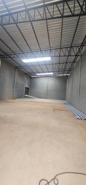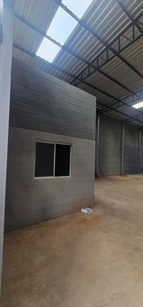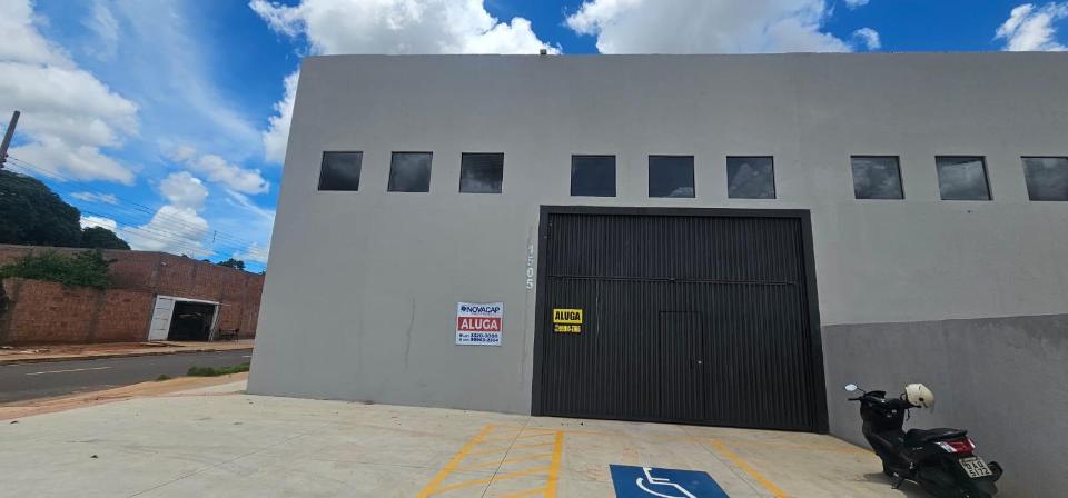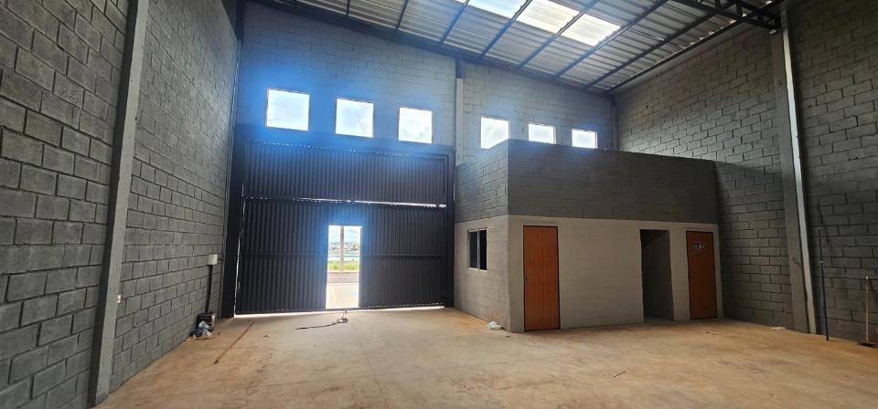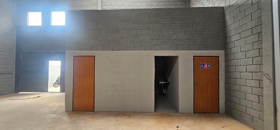 Salão amplo de esquina com duas entradas, com escritório e banheiro social. Portões de 5,70 m de largura por 4,5 m de altura. Pé direito de 7 m de altura
